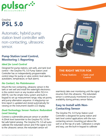 Automatic, hybrid pump station level controller with non-contacting, ultrasonic sensor. Designed for pump stations, wet wells, and tank level control – the Greyline PSL 5.0 Pump Station Level Controller has six independently programmable control relays for pump or valve control, level alarms, autodialers, temperature, or fault alarms.